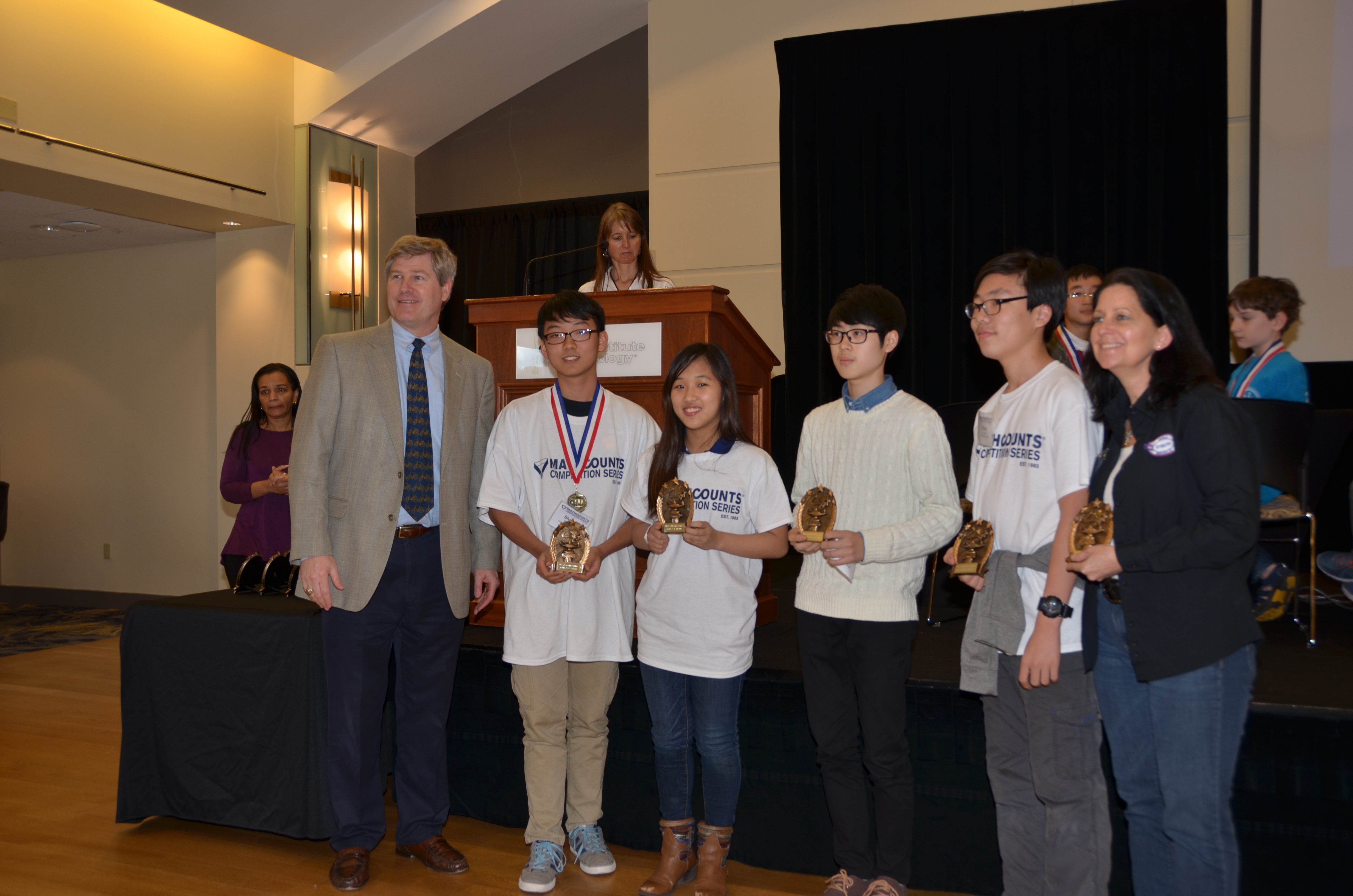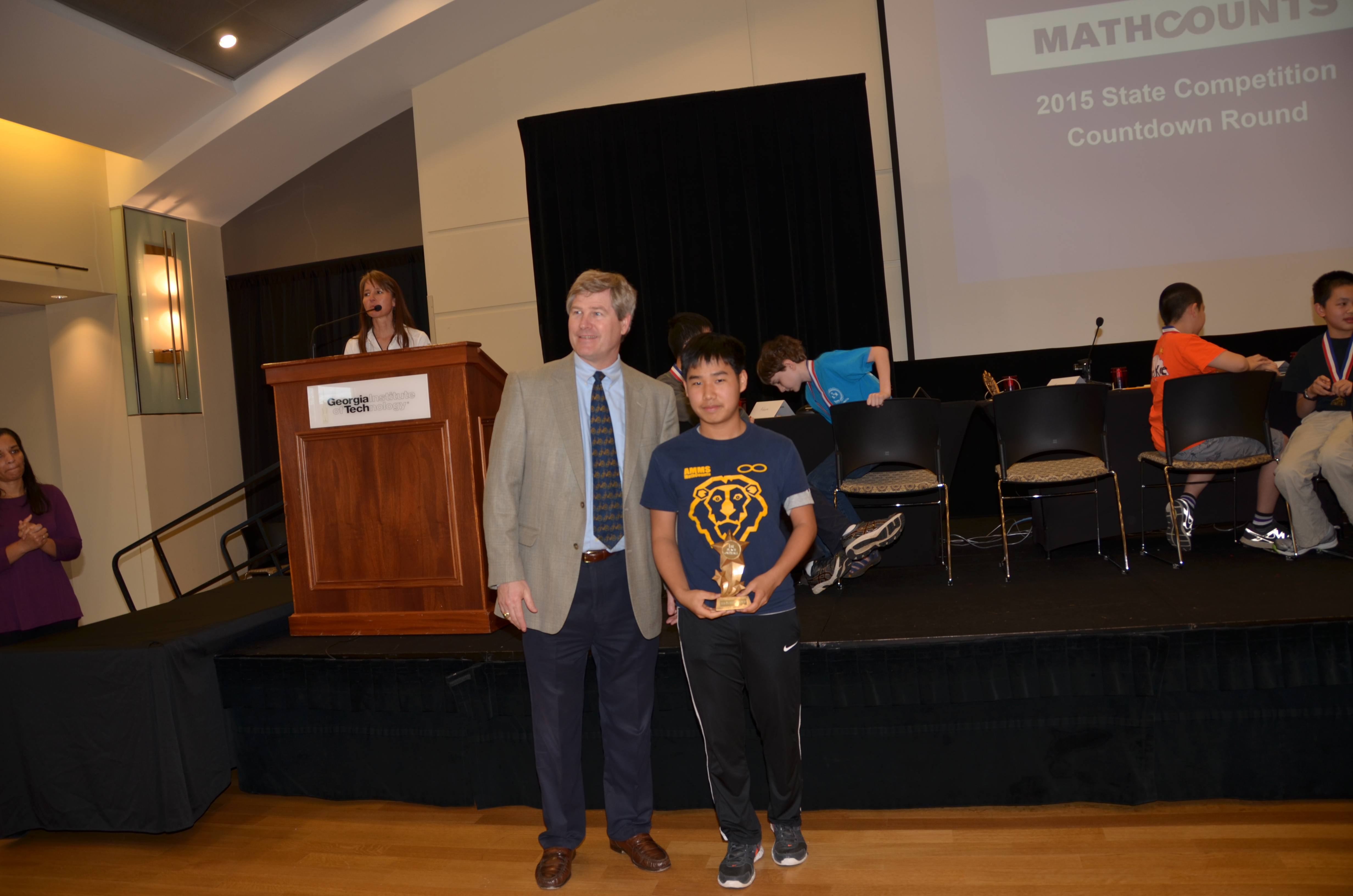 今年区域获奖者于 三月二十三日参加了全州MATHCOUNTS比赛,这场比赛选出的四名最高分获得者参加五月八日在波斯顿举办的全国总决赛。在这场全州争夺赛中, 总共有两百多名参赛者。书面比赛结束后,前十名获得最高分的同学登上主席台, 进行一场激烈的公开抢答赛(Countdown)。 这十名同学显示了全乔州Mathcounts 2015年所有中学最高成绩. 如果能进入这场决赛并进入前十名, 没有足够的实力和功底,谈何容易。比赛结果正如大家所料,陈广华全A学校再次以最高比例胜出,该校有八名学生进入十强。前四名全部是陈广华全A学校Mathcounts比赛班的学生,这四名同学将代表Georgia州参加全国最后总决赛。另外包括公开抢答赛的前三名也由陈广华全A学校的同学们一举夺得。除了前十强的绝对胜出,这次比赛前二十五名学生有十六名的获胜者来自陈广华全A学校。这种超级突出的成绩让许多老师和家长都对陈广华全A学校赞不绝口,他们说你们学校囊括了全州所有的最高奖项,实在是太不容易了,太了不起了。但大家说,该校这么多年每年都有如此好的成绩,所以这个结果其实并不令人感到惊讶了。